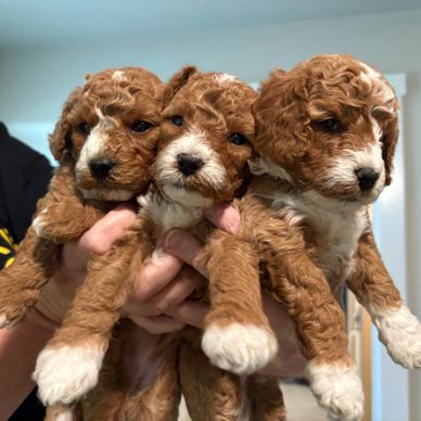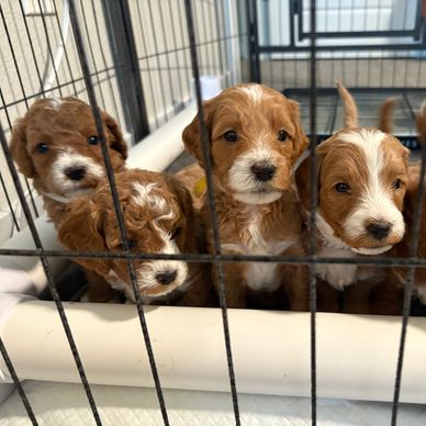 All of our puppies are raised in our home with love and care. They are exposed daily to different sounds, smells, grooming and experiences to help them develop into confident and well-socialized puppies. We provide all necessary vaccinations and deworming before sending them to their new homes. The come to "Puppy puppy puppy" said in a high pitch tone. They are groomed often and ready for lovin'!